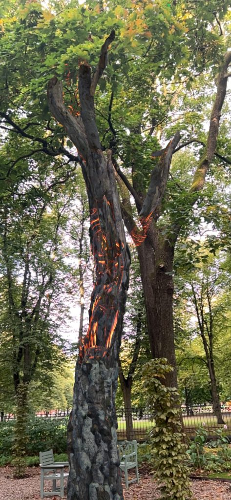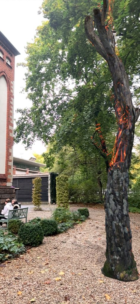 In Ember, fire embodies both destruction and rebirth. As viewers move through the augmented reality environment, their devices become extensions of the body, activating layers of sound hidden around the burning tree, such as chirping insects, croaking toads, and the whispering wind, forming an ecological resonance full of vitality. When the device enters the inner space of the tree, low-frequency vibrations from the wooden fibers respond to the lingering pulse of life that remains after the fire.